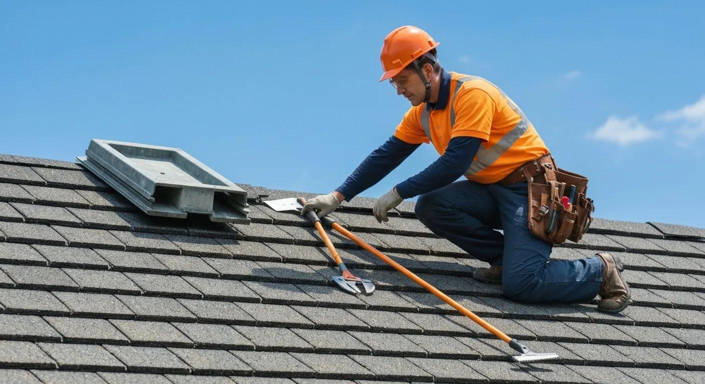 Professional roofer inspecting a residential roof with tools and safety gear